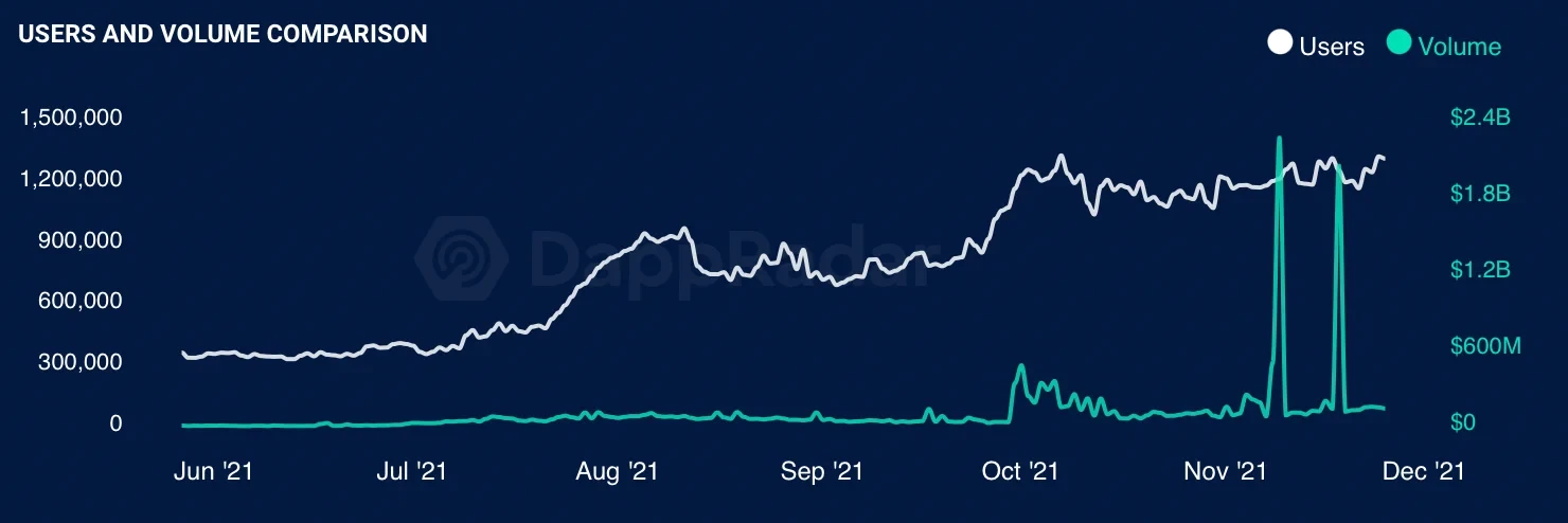 从用户参与程度来看,DappRadar数据显示,今年10月,与游戏相关的活跃钱包数量占到了区块链行业总数的55%,11月与游戏相关的流量比 10 月增加了 14%,DappRadar预计到 11 月底将增加 63%。P2E游戏的流量所占主导地位也在增长。据Dappradar数据显示,自今年7月以来,链游板块用户一直在稳步增长,用户量达131.8万,较今年7月初增长了约262%,交易量在11月多次突破2亿美元,截至11月25日,当前链游板块的交易量为1.42亿美元。