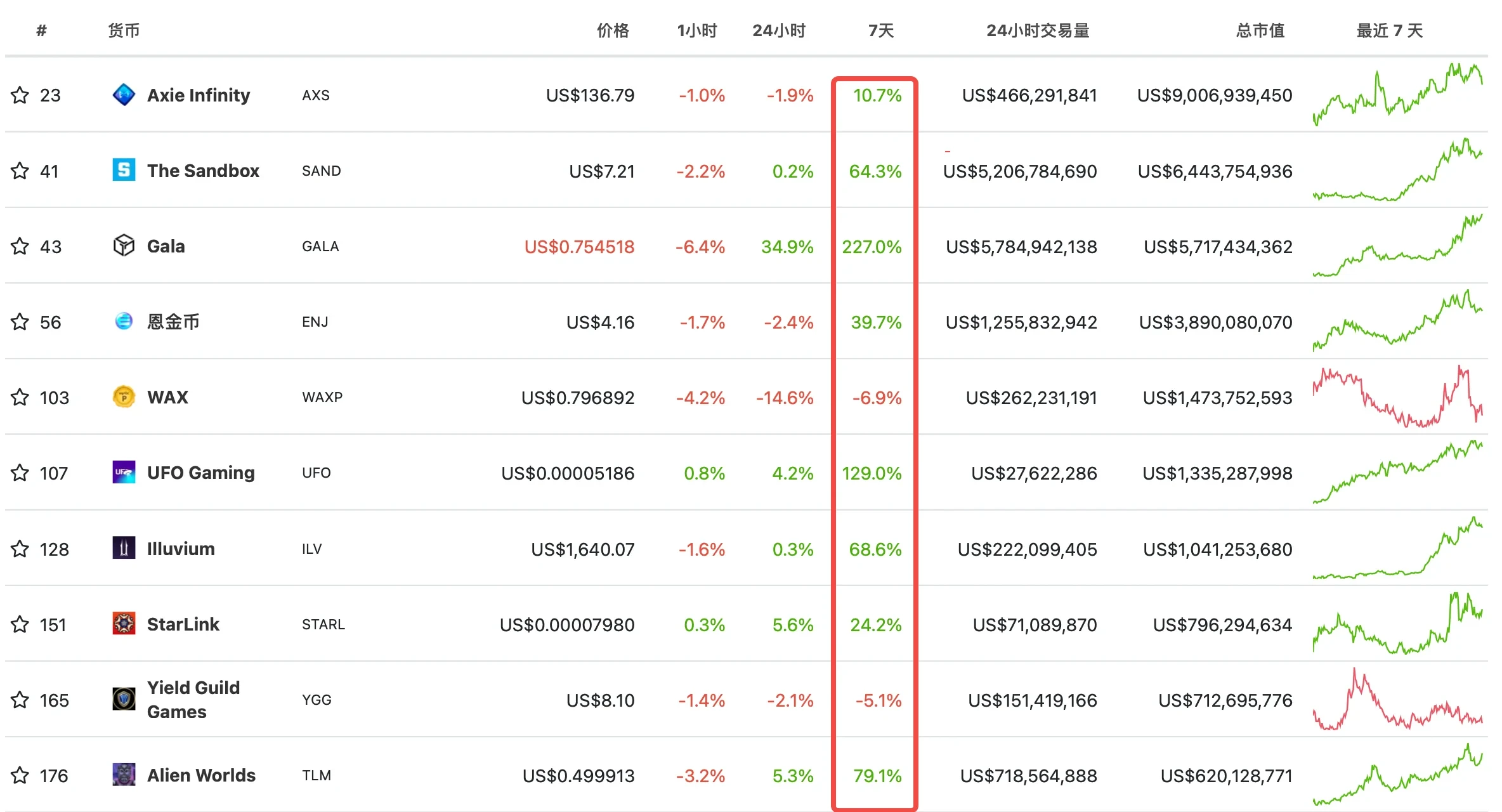 在多方热度推动下,这些游戏项目的市场表现已经给出了相应的反应。据Coingecko数据显示,近一周游戏板块的不少代币都出现了不同程度的大涨,比如GALA(Gala)近7日涨幅高达227%,TLM(Alien Worlds)上涨79.1%,SAND(The Sandbox)近七日涨幅64.3%,ILV(Illuvium)近7日上涨68.6%,GODS(Gods Unchained)上涨51.2%。