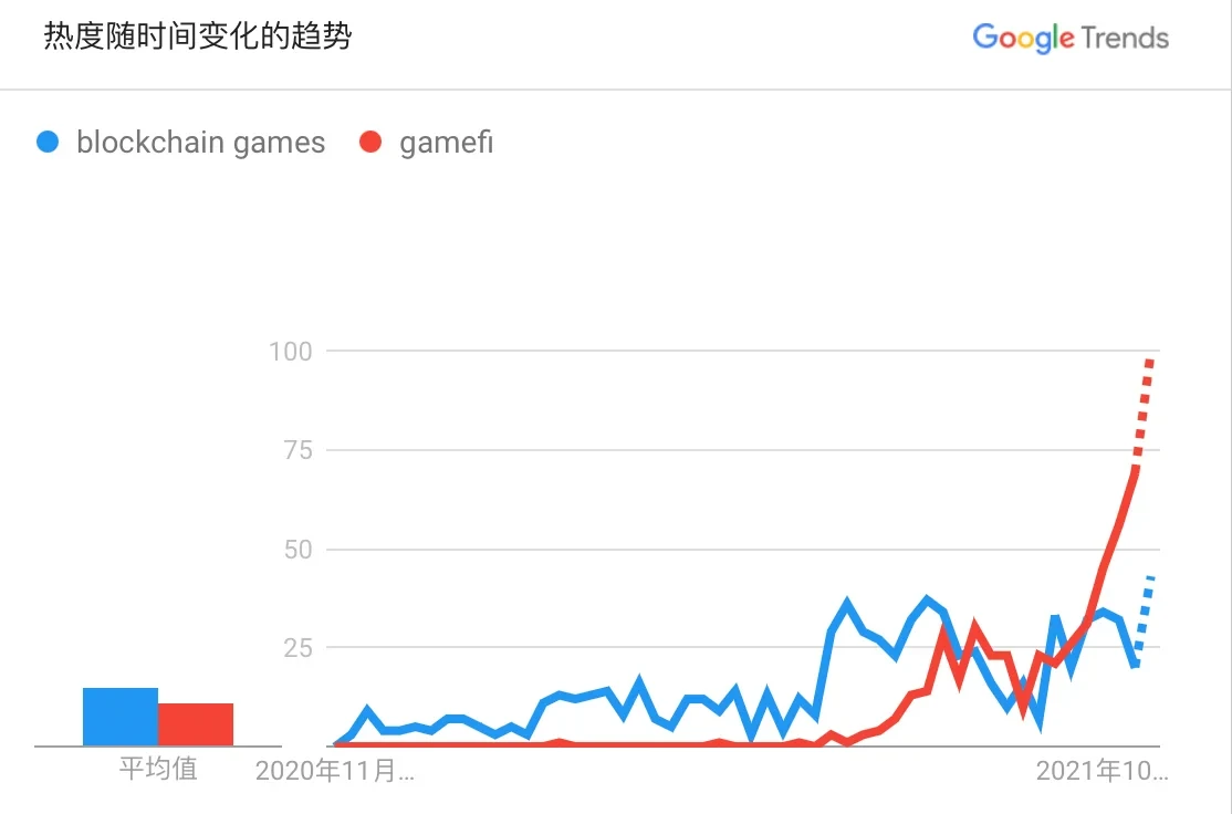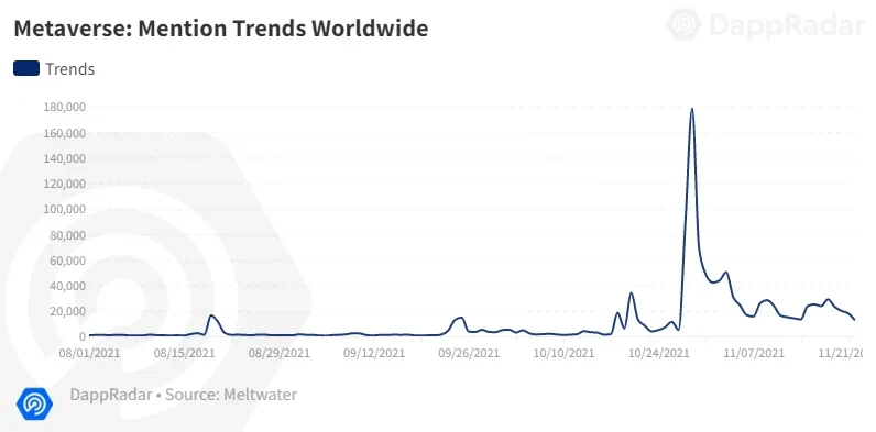 除GameFi,元宇宙也是当下最为火爆的赛道。自从10月末Facebookd宣布改名“Meta”并高调宣布布局元宇宙业务,元宇宙迅速成为了加密行业乃至整个科技圈的热门话题。报告数据显示,元宇宙在全球被提及的趋势在今年11月初达到巅峰。而元宇宙的概念大火,也正在进一步加强其与区块链游戏的关联性,推动游戏市场的进一步增长。
