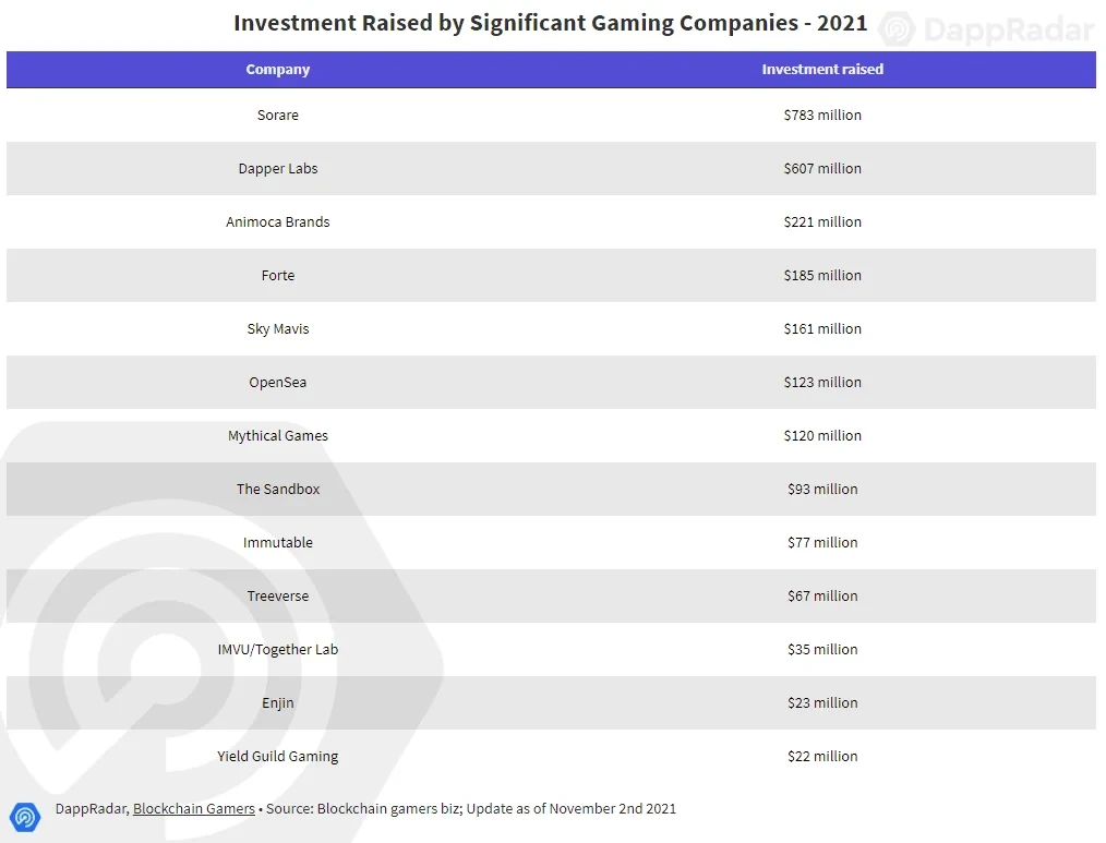 Dappraddar最新报告显示,区块链元宇宙和 play-to-earn 是亚洲地区最受关注的两个话题,在亚洲媒体上的提及次数达到 170 万次,环比增长 33%。此外,资本和流量的热度也证实了市场对P2E游戏兴趣日益增长。数据显示,投资机构对区块链游戏的兴趣越来越浓厚,仅在 2021 年,就有近 30 亿美元投资投向了游戏、虚拟世界和 NFT 相关项目,像Dapper Labs、Animoca Brands等知名游戏公司分别获得了6.07亿美元和2.21亿美元的投资。