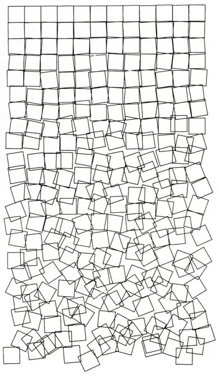 想象一下,如果你是Georg Nees ,你会如何按照“渐次出现的方格的位置与角度随机性开始不断增加”的要求完成这幅作品?当然,画方框这是任何人都能办到的,但关键问题是你如何控制处于不同位置的方格的角度与位置的随机性?这是很难靠人手工完成的。