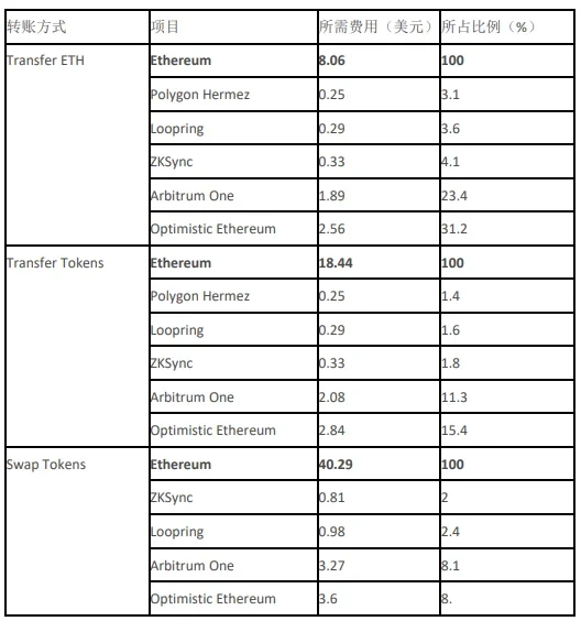 根据l2fees网站统计,在使用L2针对ETH/Tokens/Swap转账时,节省手续费普遍能够达到90%以上。例如,Polygon Hermez在转账ETH时,手续费仅为0.25美元,是直接使用以太坊主网成本的3.1%,再例如,使用Loopring转账ERC 20 Tokens时,手续费仅为0.29,是直接使用以太坊主网成本的1.6%。