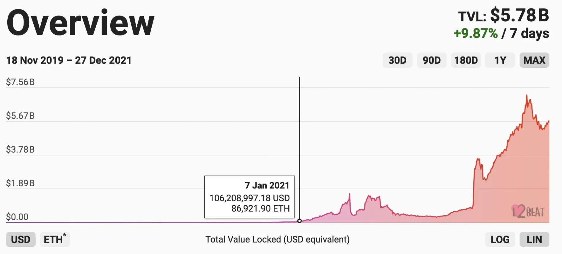 2021年是以太坊L2突飞猛进的一年。据L2BEAT数据,整个以太坊L2锁仓量从2021年1月份的0.49亿美元上涨至目前的57.8亿美元,涨幅过百倍,近半年增长将近18倍。其中,Arbitrum网络锁仓量最高,为25.4亿美元,占L2总锁仓量的44%;其次,dYdX锁仓量为9.77亿美元,占比17%;锁仓量第三名为Loopring,为5.83亿美元,占比10%。