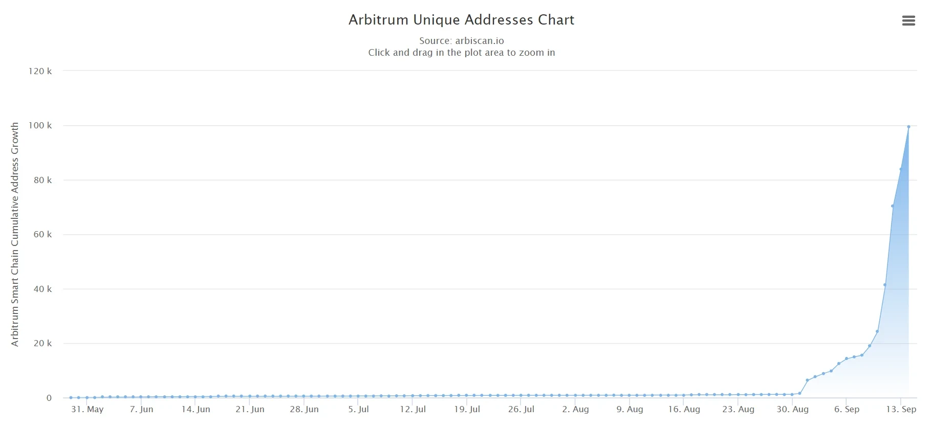 以Arbitrum为例,Arbiscan数据显示,Arbitrum的独立地址数增长曲线陡峭,仅一周时间,就从14,958涨至99,485,涨幅达到了565%。日交易次数最高达到了26.76万次,