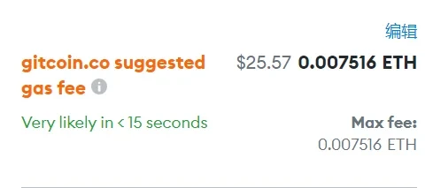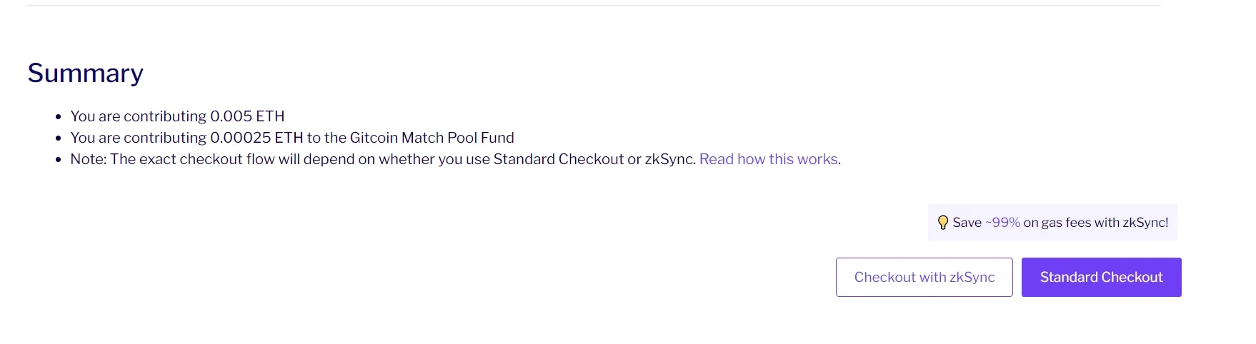 我们再换另一种方式体验ZKSync,打开Gitcoin,选择一个捐赠项目,输入你想捐赠的金额,第一种选择“Standard Checkout”,即使用以太坊L1进行付款,此时的Gas费为25.57美元。