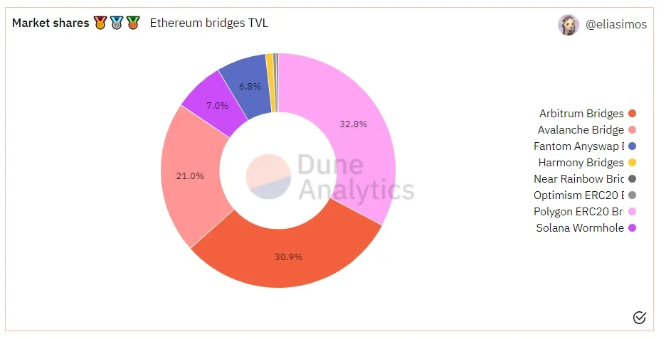 目前,DuneAnalytics数据显示,Arbitrum在以太坊桥中的资产锁定总量占比为30.9%,距离Polygon的32.8%,差距正在缩小。目前SushiSwap、Uniswap V3、DoDo、Balancer、Curve、Metamask、Chainlink等都已经在Arbitrum上部署。据悉,Arbitrum将于10月22日对所有项目开放免许可代币桥接功能,该功能适用于基本的ERC20代币的功能以及L1和L2上的可传属性,也可以允许项目方或个人对ERC20代币部署例如治理、快照等功能,而在10月22日之前,该功能仅对白名单内的项目代币开放,项目方可以联系Arbitrum进行提前部署。从DeFillama上看到,Arbitrum的总锁仓量已经高过了Fantom、Near等一众公链。