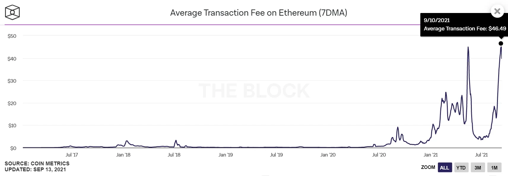 The Block以美元为计量单位的图表更加直观,可以看出,NFT Summer以来,用户参与链上交互的费用日益增加,而在近期热点dYdX解除治理代币DYDX转账限制的当晚,以太坊的手续费更是一度飙升至150美元以上,这样高昂的成本令大多数用户望而却步。