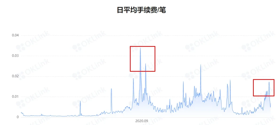 OKLink数据显示,近期以太坊的日平均手续费高点出现在9月8日,0.017 ETH/笔,按欧易当日收盘价3,499美元计算,9月8日的日平均手续费差不多是60美元。上一轮DeFi Summer的高点出现在2020年9月2日,0.034 ETH/笔,按欧易当日收盘价440美元计算,最高点的日平均手续费差不多是15美元。