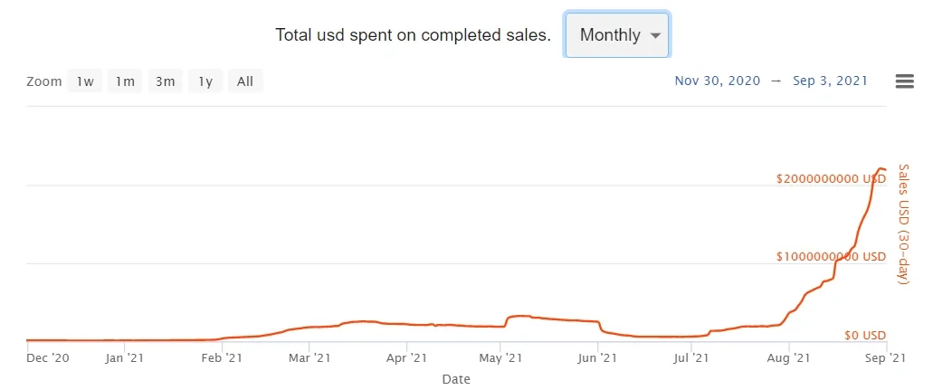 Nonfungible数据显示,NFT市场月交易额从5月底的2.52亿美元,一路攀升至8月底的22.03亿美元,涨幅达到了774%。