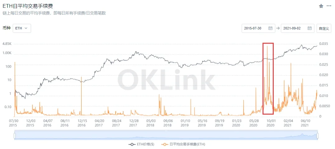 接下来再来聊一聊,我们在此期间所观察到的和去年DeFi Summer所不一样的地方。最显而易见的一点便是二者对以太坊链上交易手续费的波动影响不同,虽然已时隔一年有余,但是去年DeFi 的火爆盛况所带来的以太坊链上手续费高涨至今令人印象深刻,据OKLink的统计数据,2020年DeFi Summer期间推高的以太坊手续费水平,至今仍是历史最高记录。