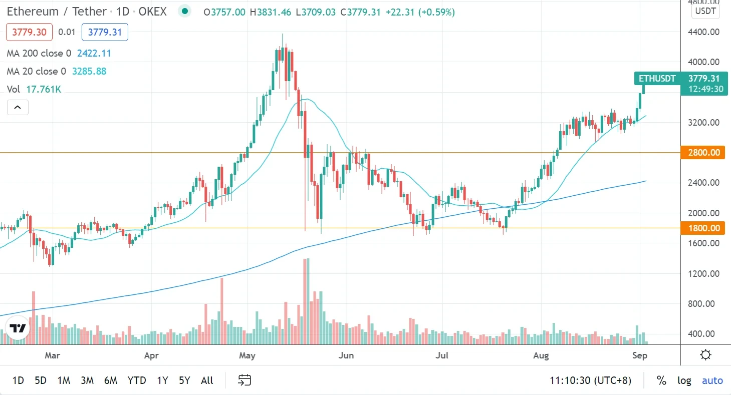 从以太坊7月21日的开盘价1,805美元算起,截至9月2日以3,757美元收盘,以太坊在43天的时间里,上涨了108%。