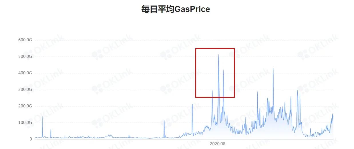 OKLink数据显示,在DeFi热潮兴起之前,以太坊的每日平均Gas价格在5-10 Gwei之间,但是在6月16日推出流动性挖矿后,每日平均价格是节节走高,其中在9月2日更是达到了惊人的514.54 Gwei,上涨了50-100倍,20-30美元的手续费比比皆是,而对于资金体量小的用户,更是出现了挖矿收益抵不上手续费的情况,Cobo联合创始人神鱼彼时在微博上直言,5万美元的资金体量才差不多能覆盖高Gas费。