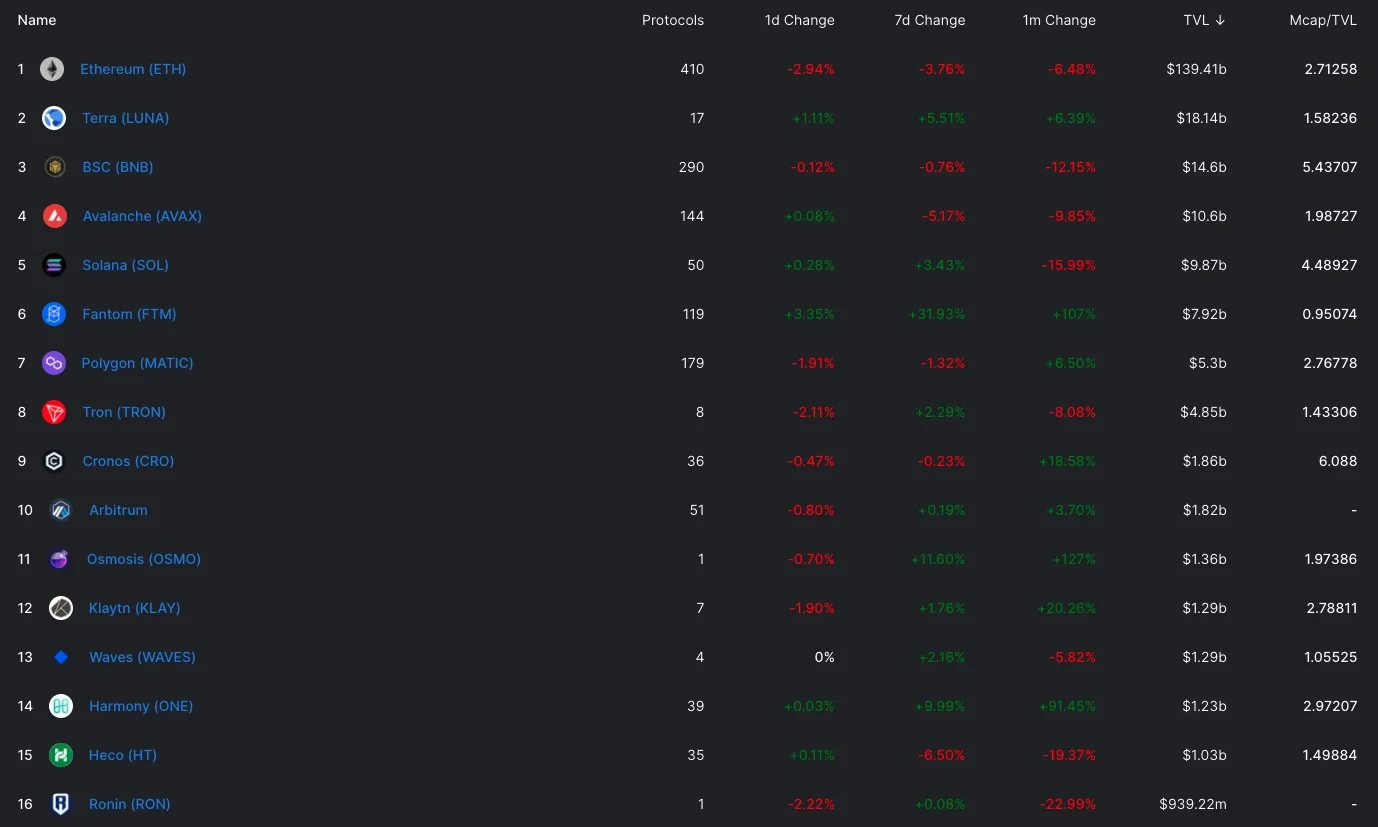 不过,在多区块链生态中,事情就不太一样了。随着Ethereum/Solana/Terra/Polkadot/Avalanche/Polygon/Cosmos/Near等底层技术的不断发展,一方面锁仓量屡创新高,仅TVL总价值10美元的底层协议就超过16个,以太坊一家锁仓量就达到1390亿美元,另一方面,基于不同基础设施的应用数量与品类也不断增长,截至目前,市值排名前三的底层公链应用数量就多达上千。