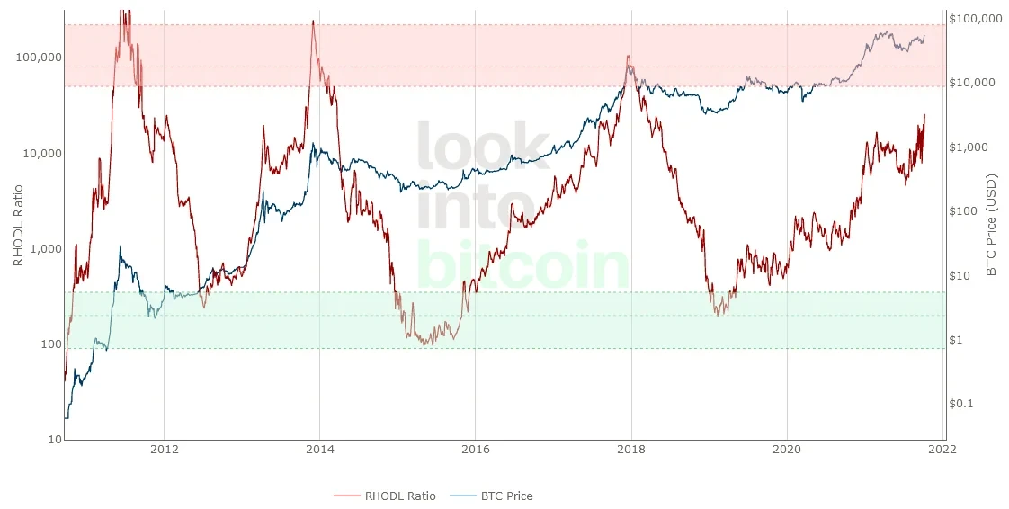 分子分母分别是每个段内代币的已实现价值(Realized Value)加权,所谓已实现价值是比特币最后一次从一个钱包转移到另一个钱包时的价值。RHODL Ratio具体是指1周之内的已实现价值与1-2年的已实现价值的比率,当1周值明显高于1-2年值时,即1周内移动的比特币数量过多时,表明此时市场热度过高。