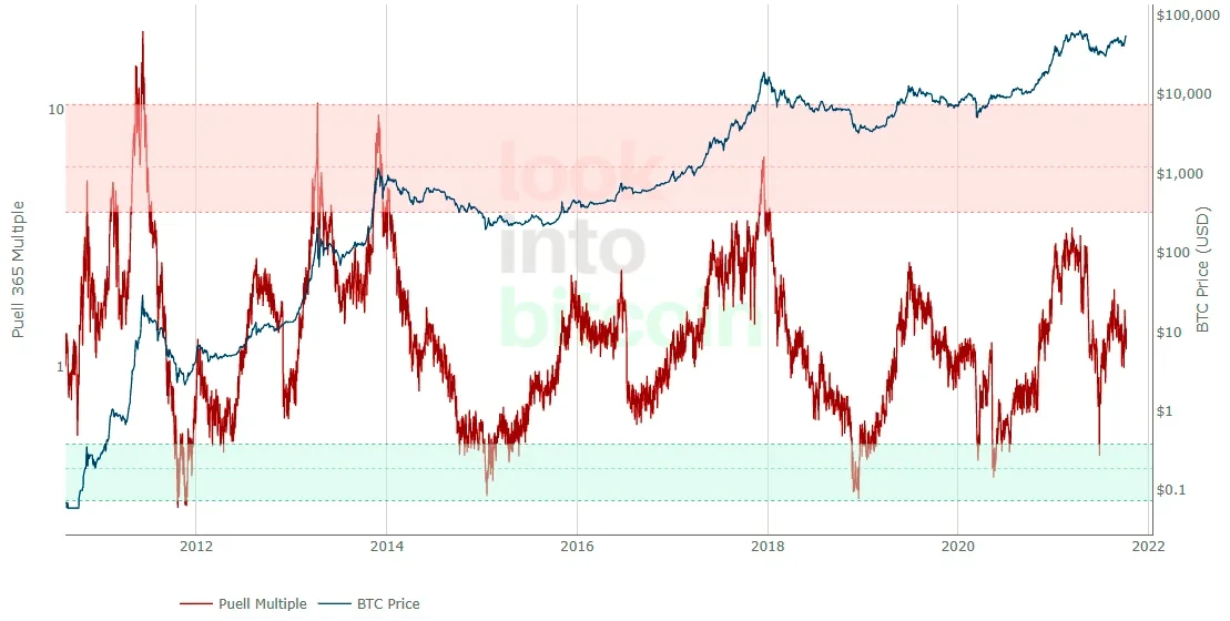 另一个在功能上与RHODL Ratio类似的指标也值得关注,即The Puell Multiple,该指标由推特博主David Puell于2019年3月创立。