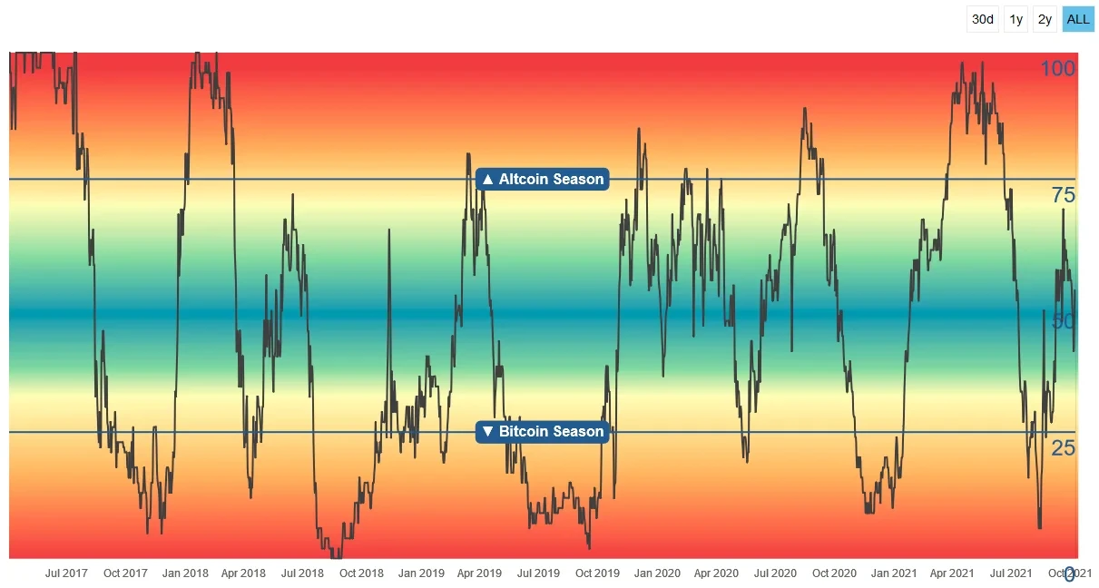 按照blockchaincenter对山寨季指数的定义,如果市值前50代币中75%的币种在连续90天价格表现优于比特币,那么此时的加密市场就处于山寨季。