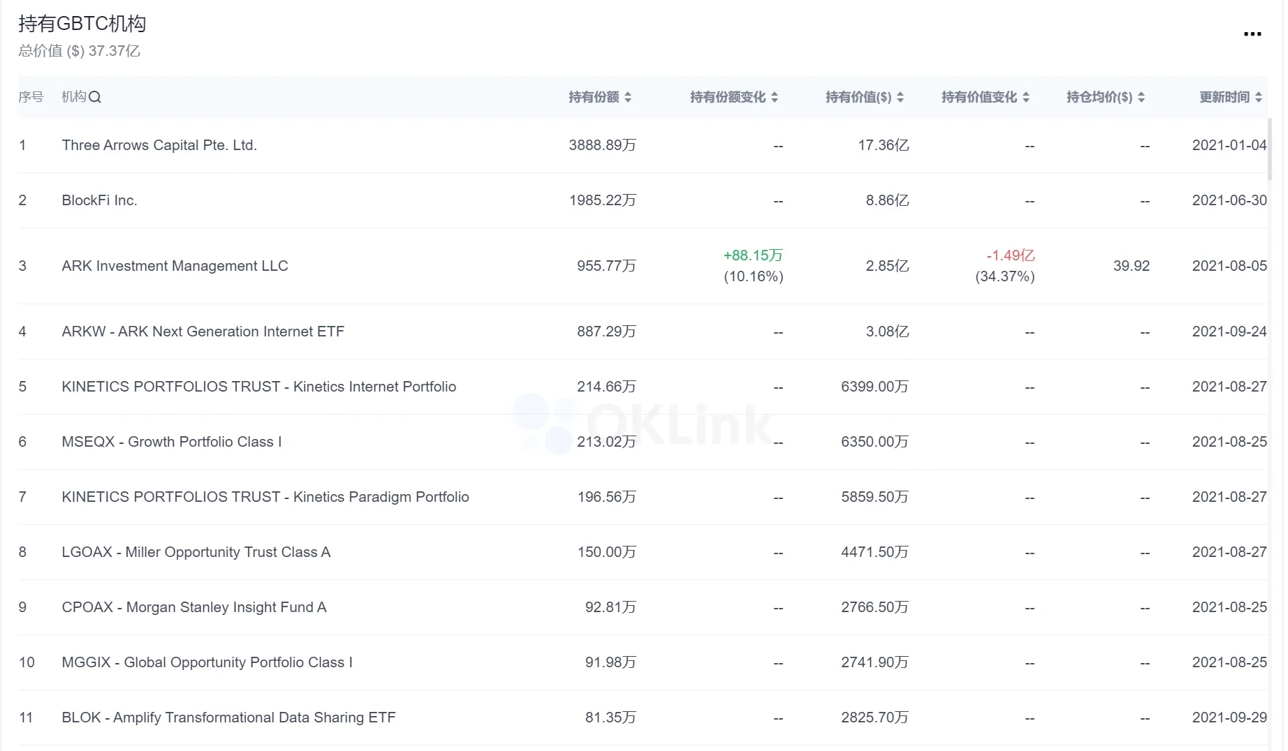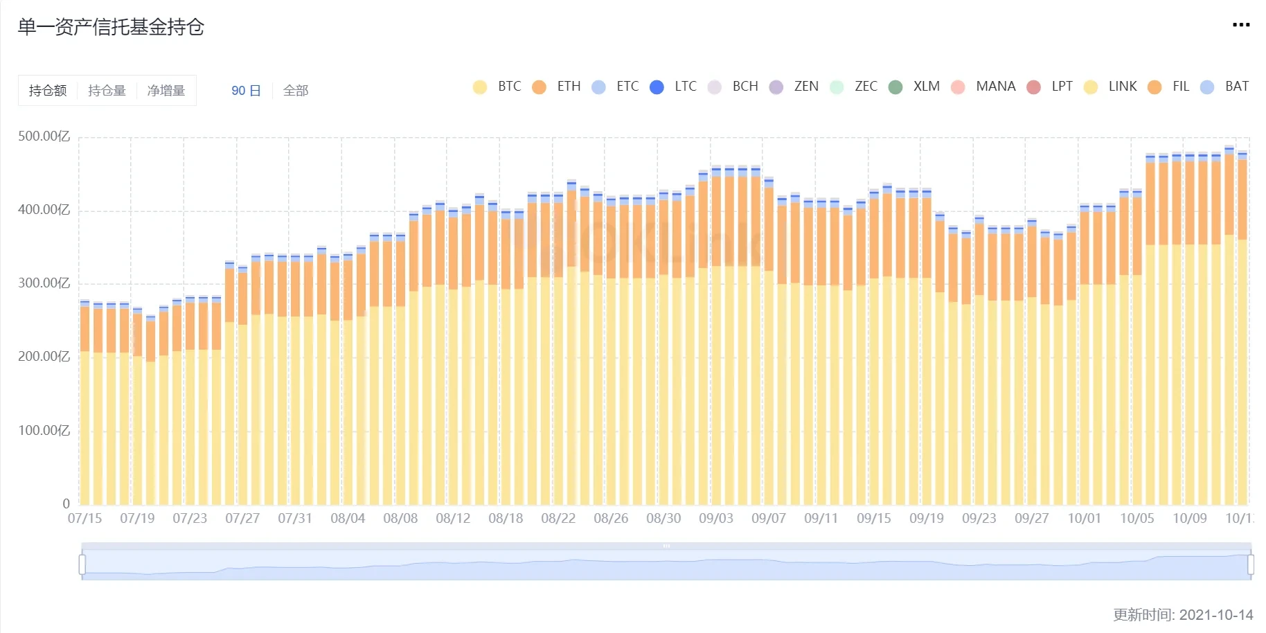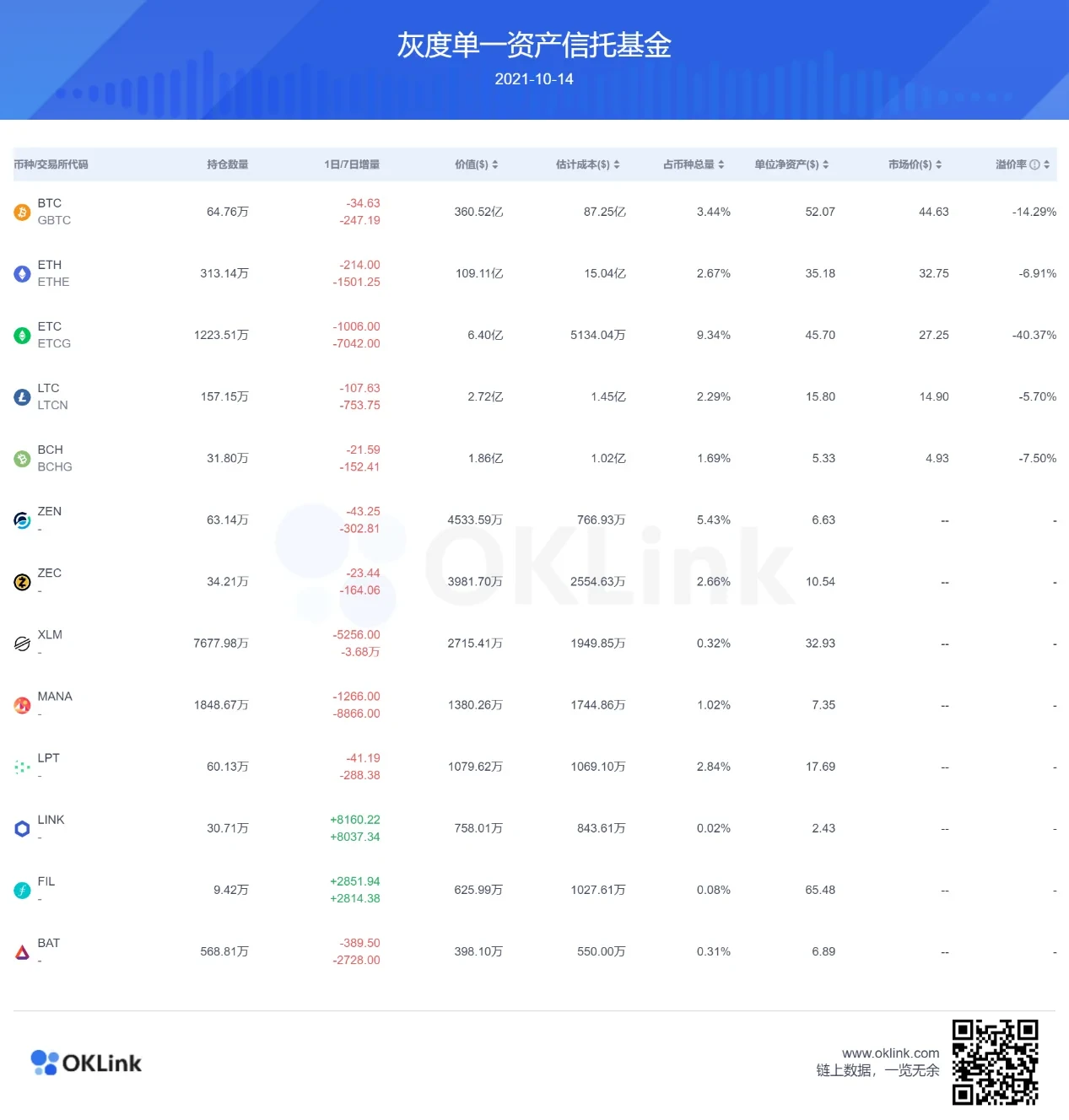 据OKLink的统计数据显示,目前灰度管理的加密资产信托基金的总市值已经达到了476.65亿美元,投资标的囊括了BTC、ETH、LTC、BCH等十余个加密资产。